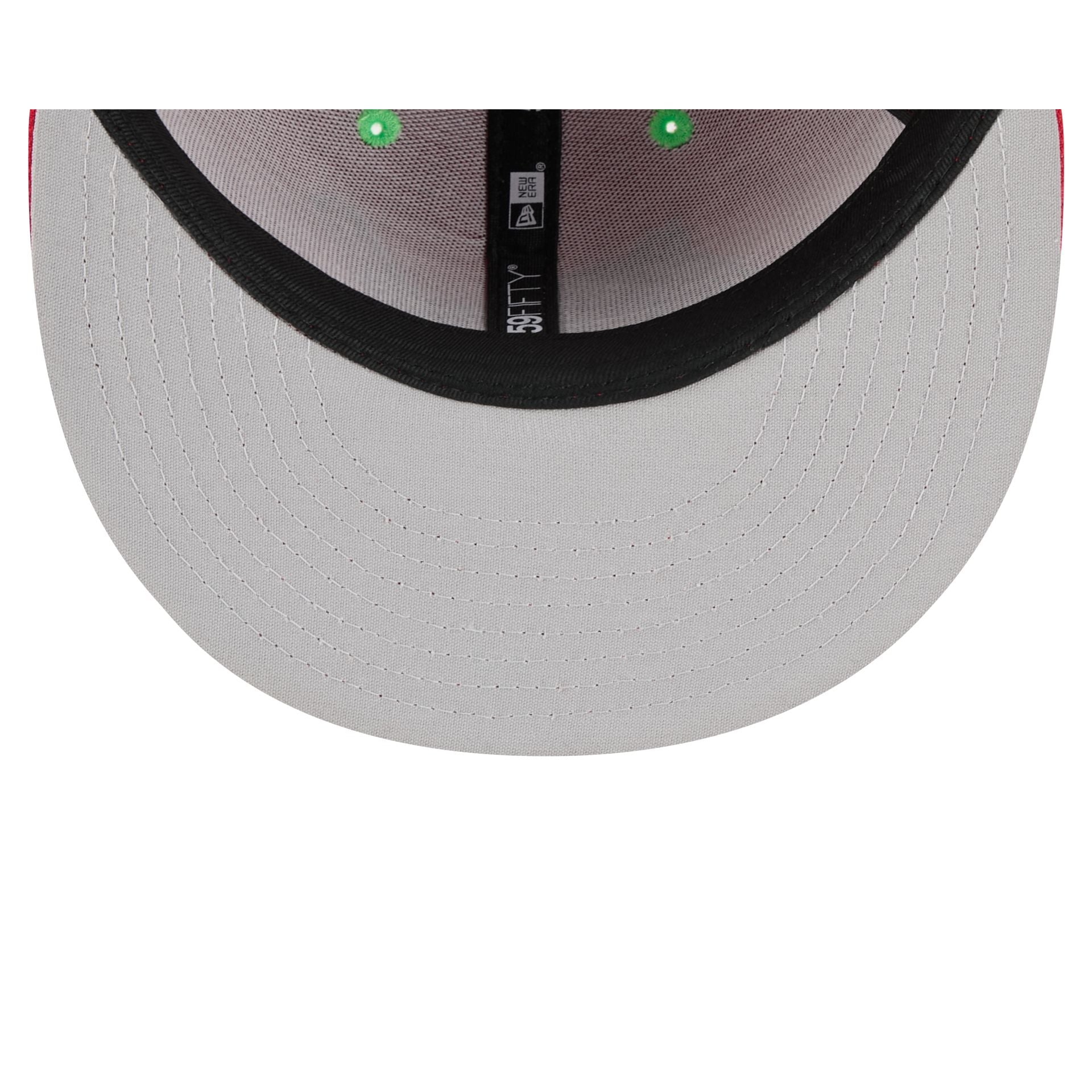 The Akron RubberDucks Theme Night Red 59FIFTY Fitted Cap features an embroidered RubberDucks theme night logo at the front panels with a matching MiLB Batterman logo at the rear and a gray undervisor.