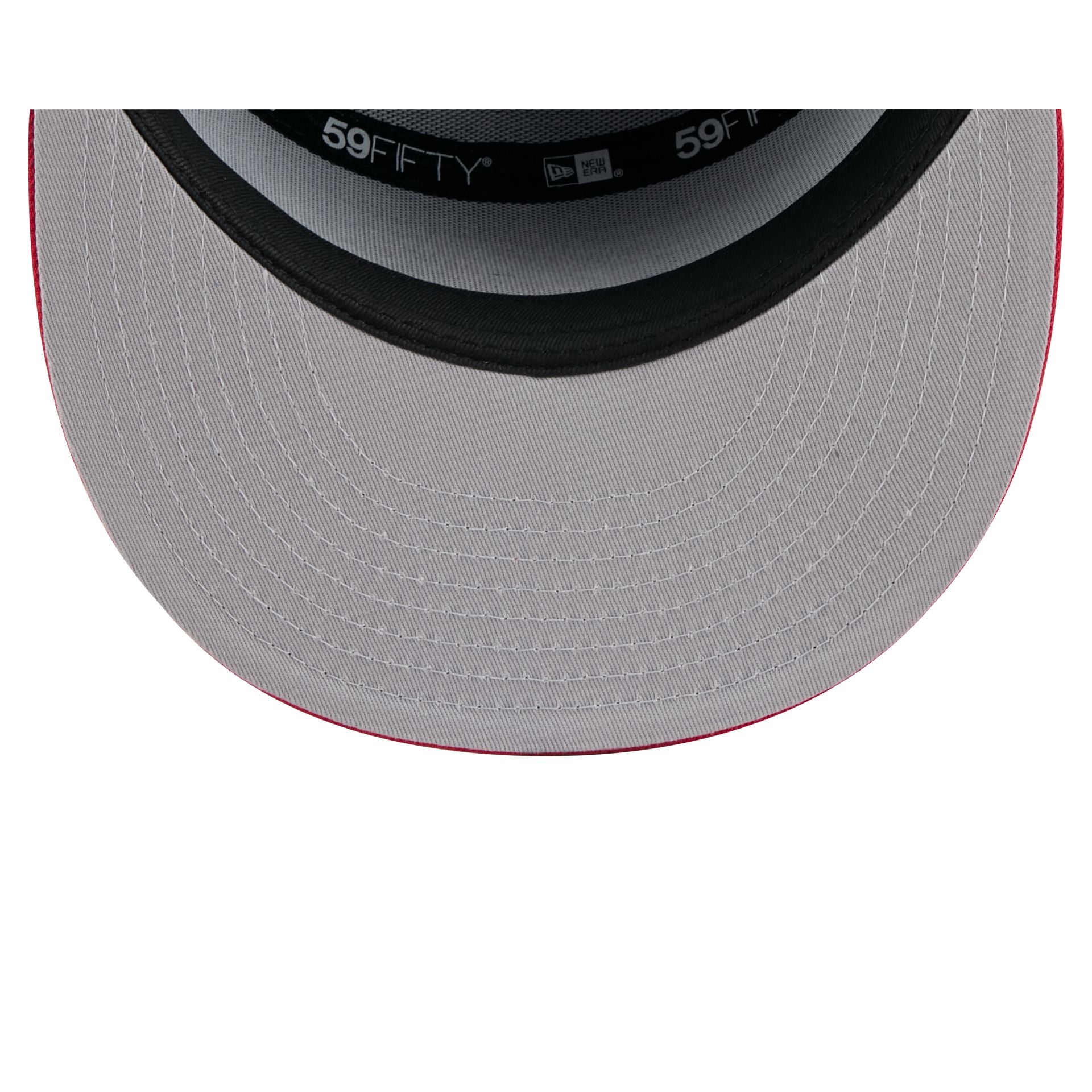 The Arizona Diamondbacks 2025 All-Star Game Workout Split Panel 59FIFTY Fitted Cap features an embroidered Diamondbacks logo at the front panels against a split-crown construction with breathable mesh fabric at the side and rear panels. Additional details include stars at the top panel, a 2025 All-Star Game patch at the right-wear side, the MLB Batterman logo at the rear, and a gray undervisor.