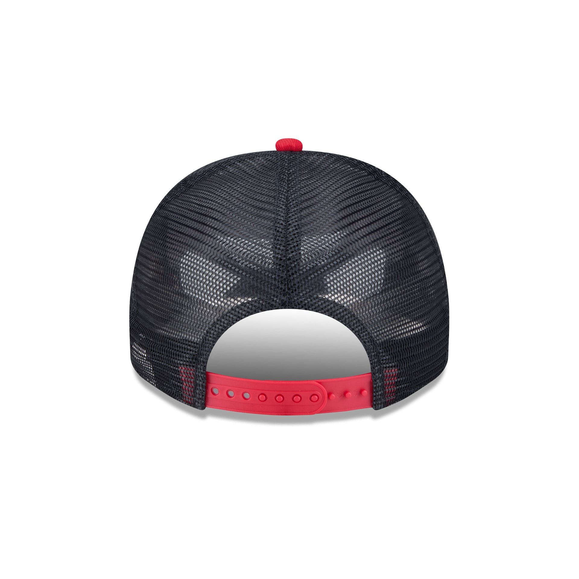 The Atlanta Braves Banner 9FIFTY A-Frame Trucker features a embroidered Braves logo at the front panels against a screen-printed stripe at the front panels. Additional details include a snapback closure at a mesh rear and a gray undervisor.