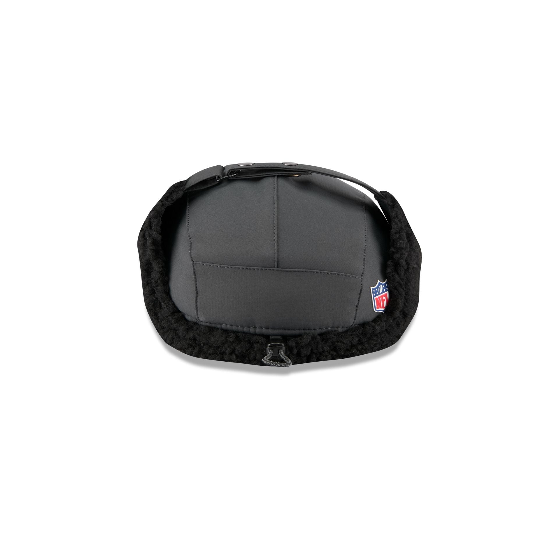 The Atlanta Falcons 2025 Sideline Cold Weather Steel Clouds Runner Dogear Adjustable Cap features a sewn-down silicone Falcons logo patch at the front panels with a water-repellent quill tech fabrication throughout with an insulated crown and sherpa lining. Additional details include a buckle strap button secured at the top of the crown that folds down to cover the ears, and an adjustable elastic toggle at the back for a customizable fit.