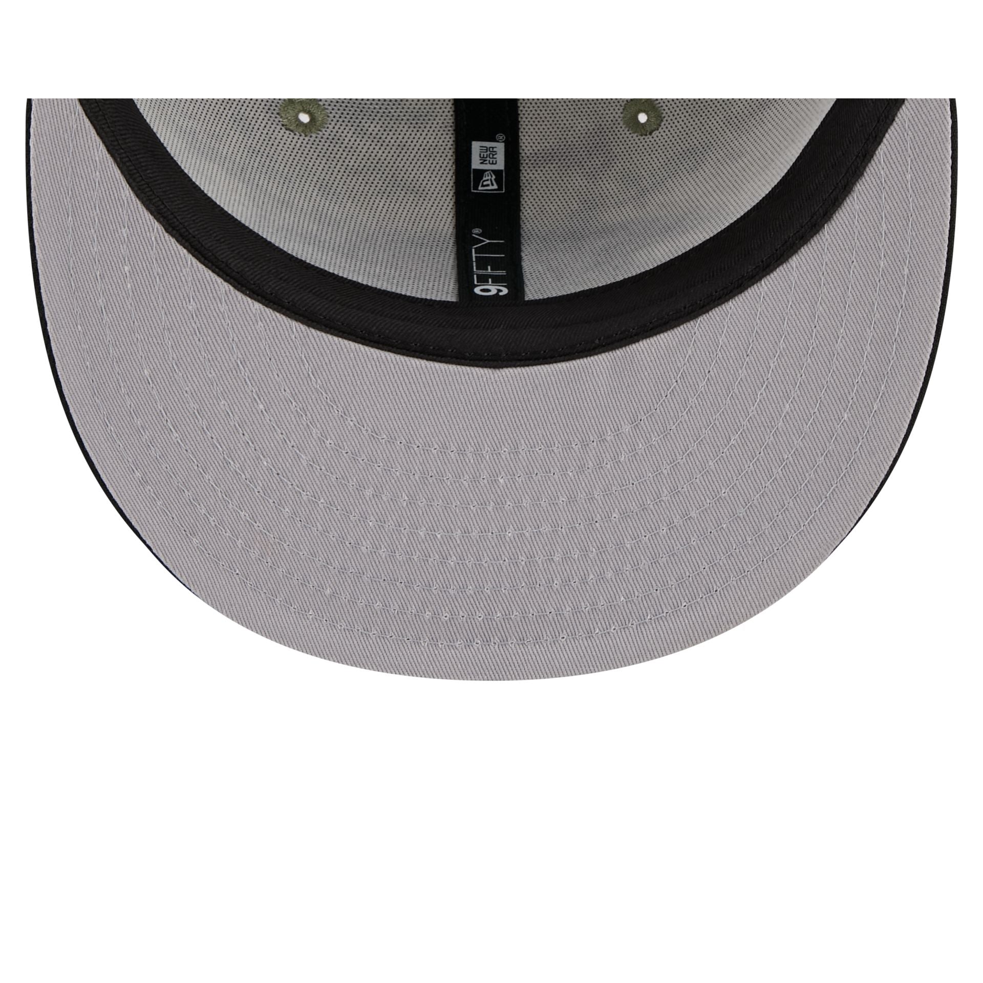 The Baltimore Ravens 2025 Salute to Service Fan Gear 9FIFTY Snapback features an embroidered Ravens logo at the front panels with the official NFL Salute to Service patch above a snapback closure at the rear. Additional details include an American flag patch at the right-wear side with team color visor and a gray undervisor.