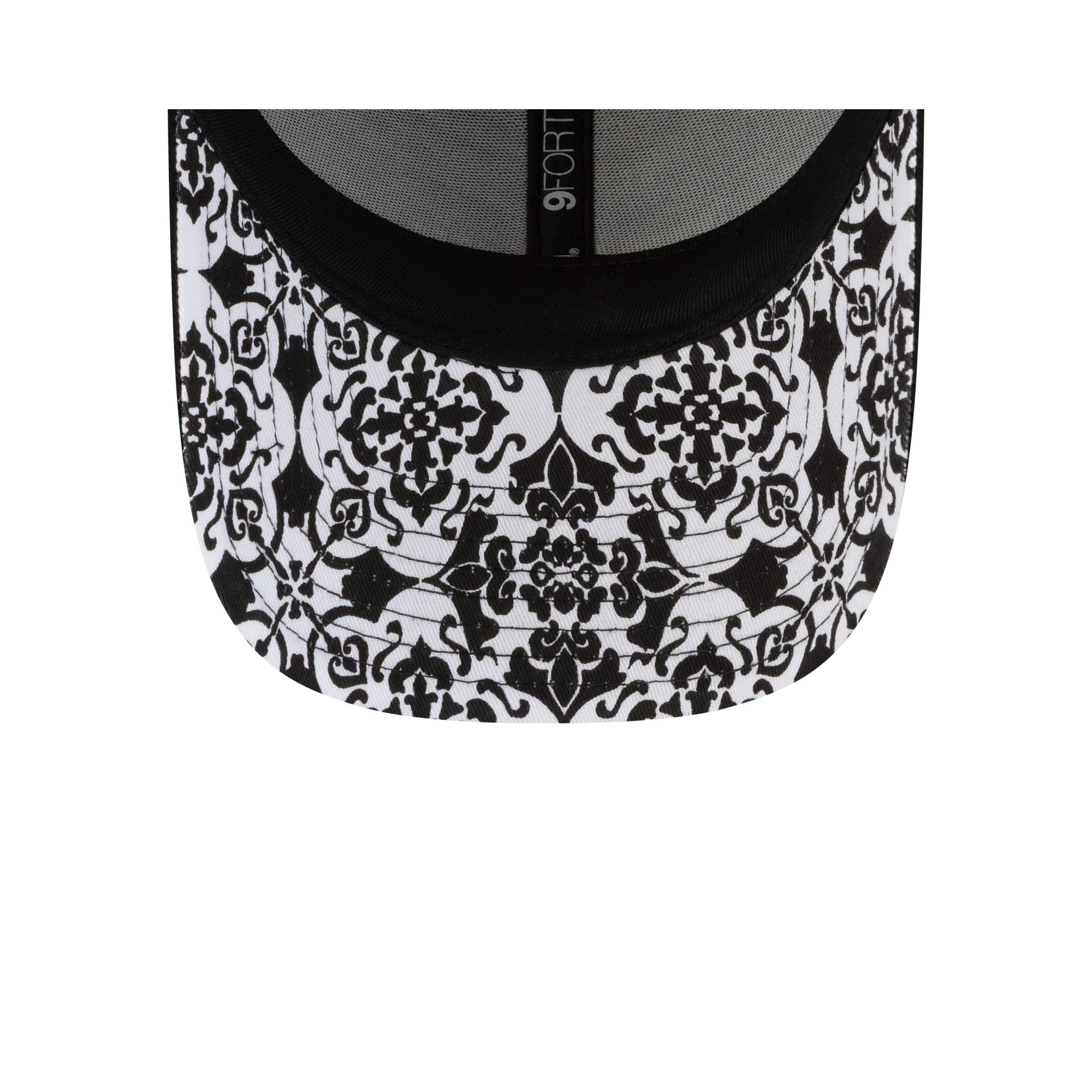 The Brooklyn Nets China Games Black 9FORTY Adjustable Cap features an embroidered Nets wordmark at the front panels with a graphic at the right-wear side. Additional details include an adjustable D-Ring closure at the rear and a patterned undervisor.