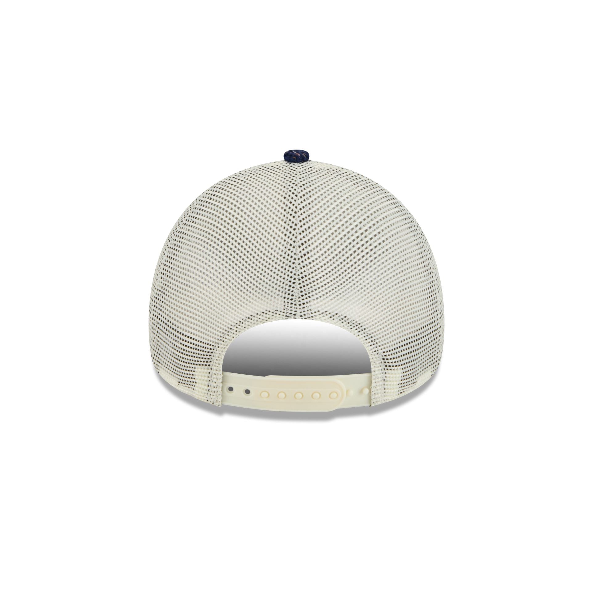 The Buffalo Bills Knit Women's 9FORTY A-Frame Trucker features an embroidered Bills logo at the front knit panels. Additional details include a snapback closure at a mesh rear and white undervisor.