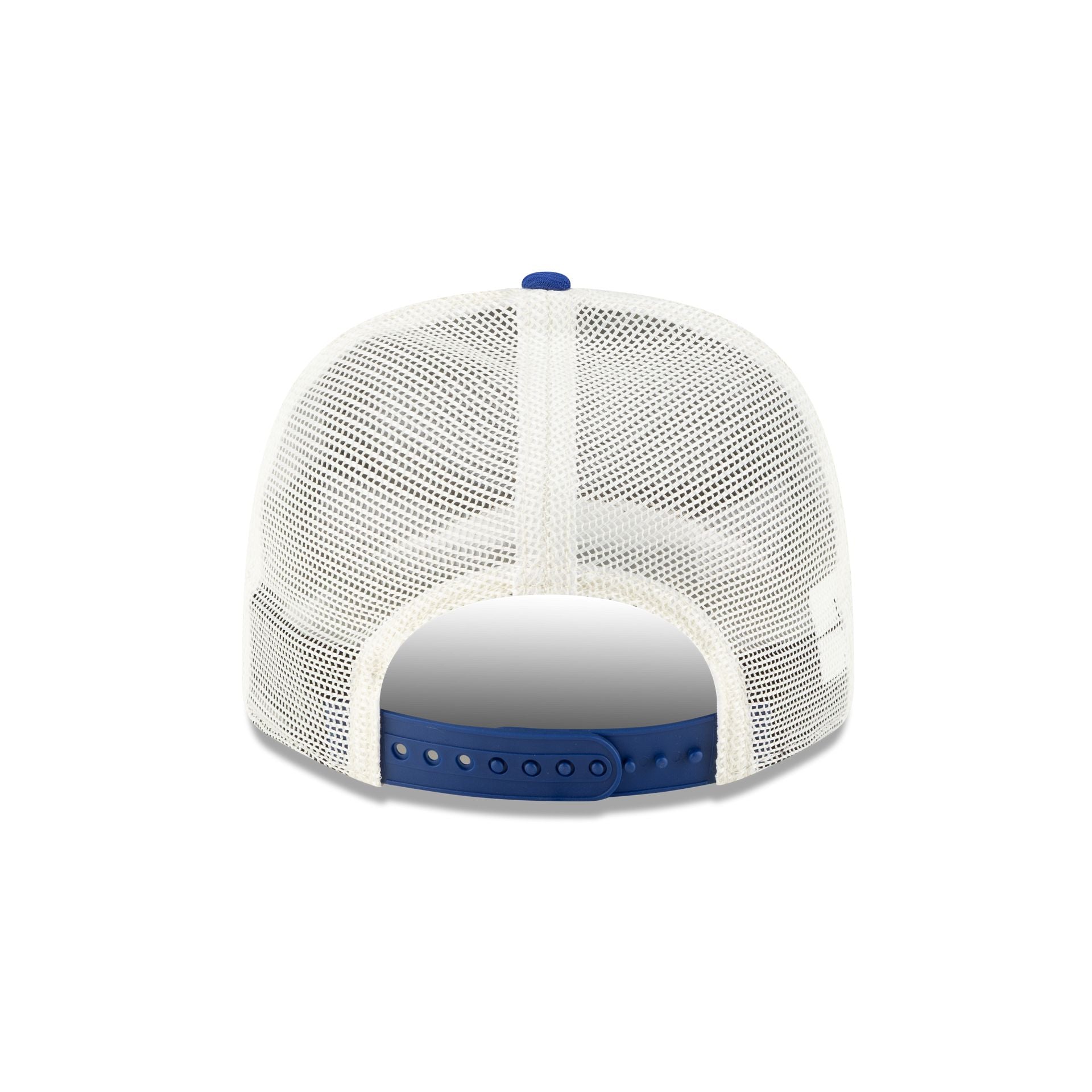 The Buffalo Bills Mascot 9SEVENTY Trucker features an embroidered Bills mascot at the front panels with a matching team logo at the right-wear side, an adjustable snapback closure at the rear, and a green undervisor.