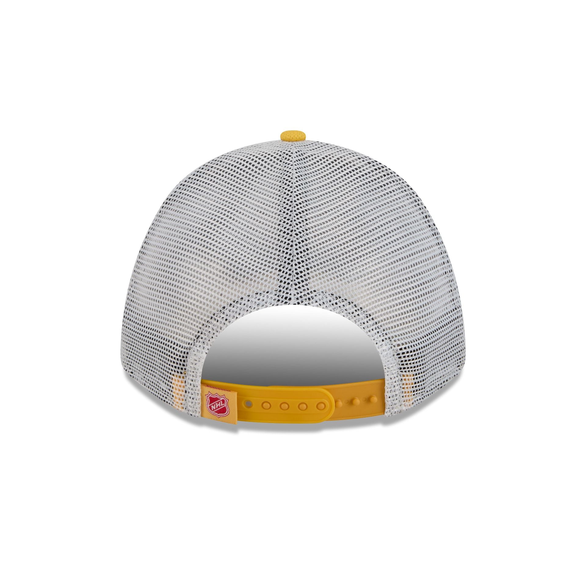 The Calgary Flames Sock 9FORTY M-Crown A-Frame Trucker features an embroidered Flames logo at the front panels against a split sock fabrication. Additional details include a snapback closure at a mesh rear.