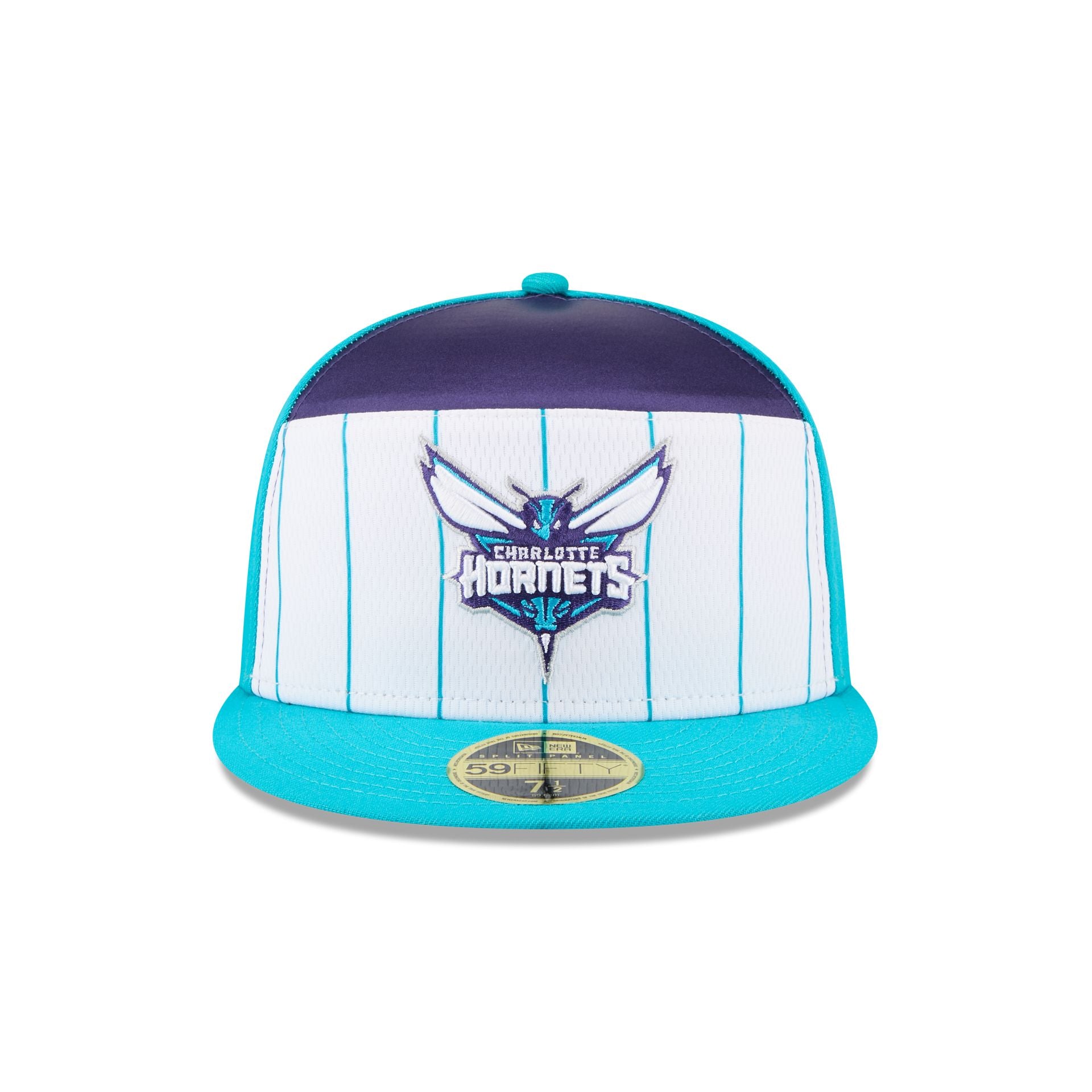 The Charlotte Hornets 2025 Tip-Off Split Panel 59FIFTY Fitted Cap features an embroidered Hornets logo at the front panels against a pinstripe jersey fabrication with the NBA Logoman at the right-wear side. Additional details include a team wordmark at the rear and a gray undervisor.