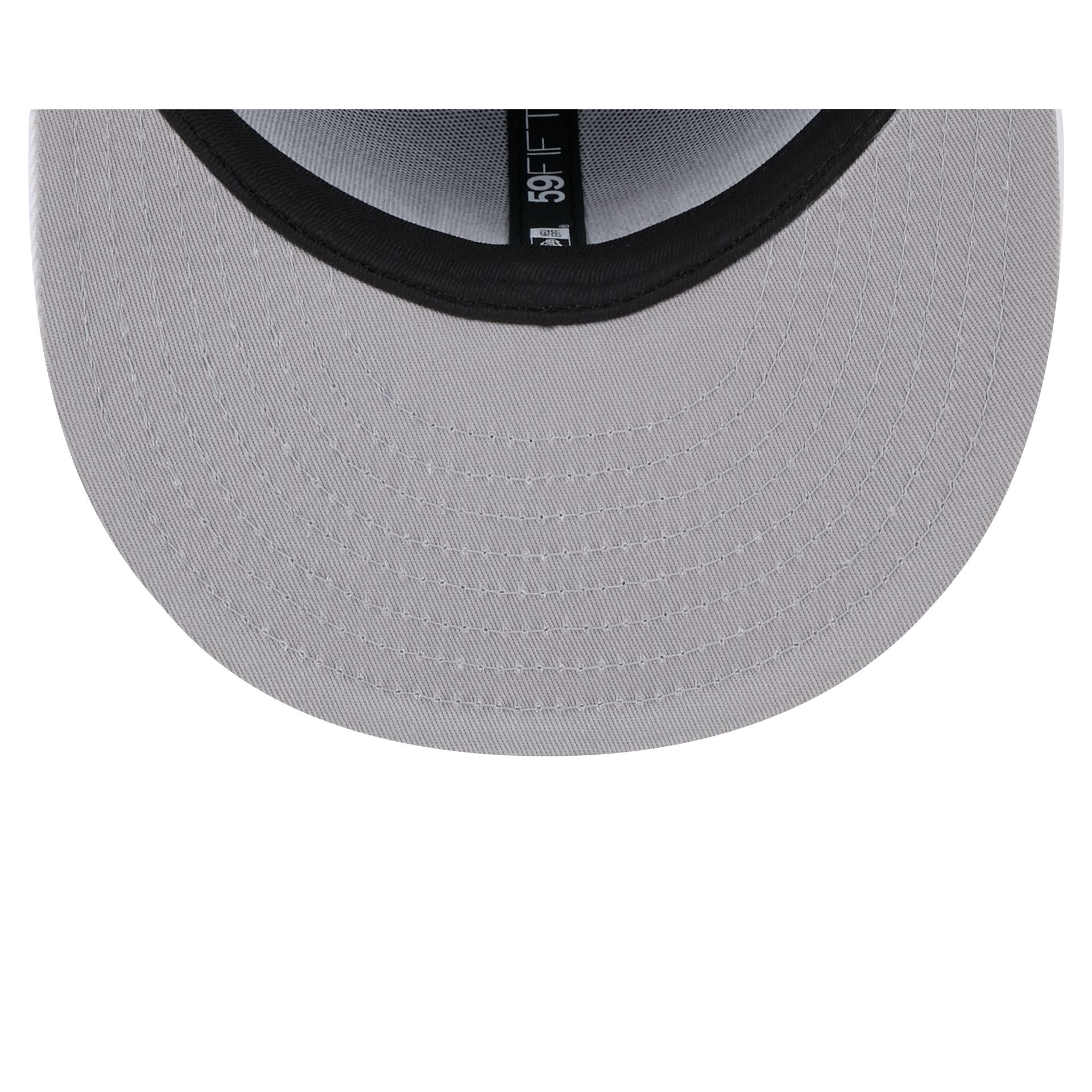 The Chicago Cubs Wave Fill 59FIFTY Fitted Cap features an embroidered wave fill Cubs wordmark at the front panels with a matching MLB Batterman logo at the rear. Additional details include a jacquard crown, a white visor, and a gray undervisor.