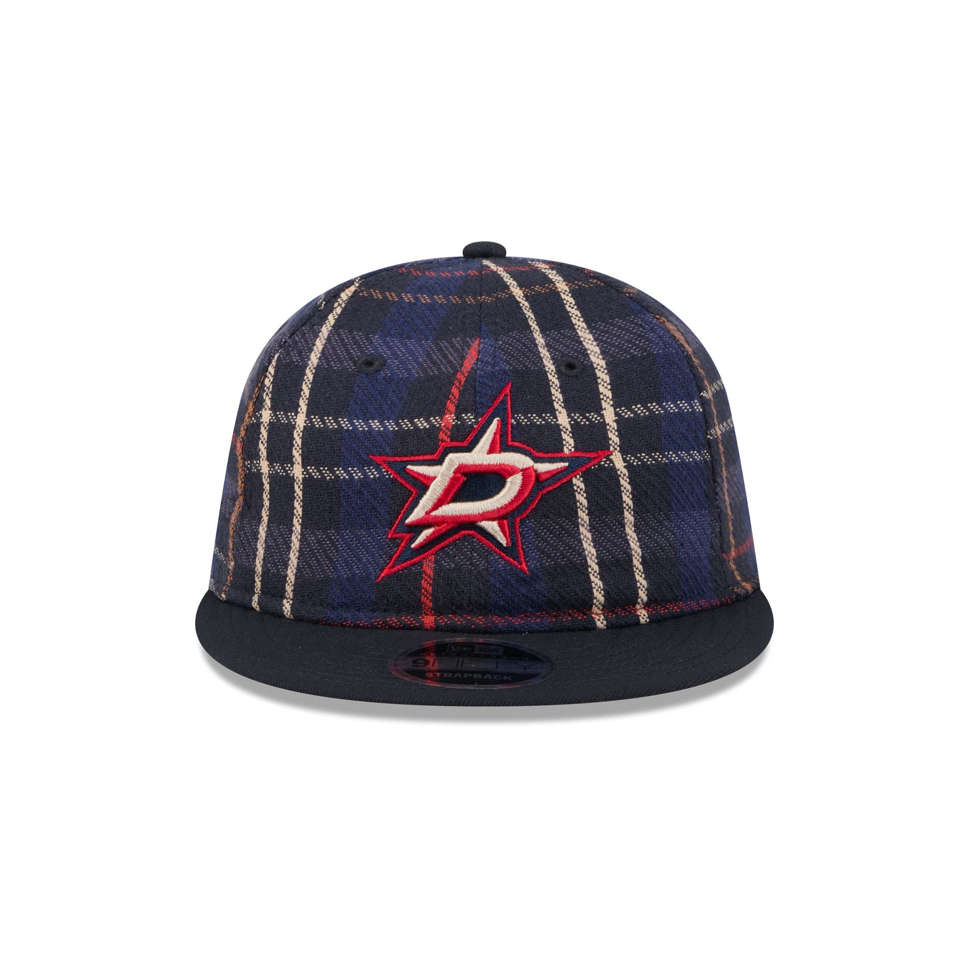The Dallas Stars Grunge Plaid Retro Crown 9FIFTY Adjustable Cap features an embroidered Stars logo at the front panels with an adjustable leather strap closure at the rear and a navy undervisor.