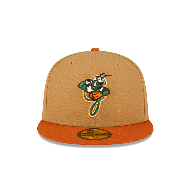 The Greensboro Grasshoppers Wheat 59FIFTY Fitted Cap features an embroidered Grasshoppers logo at the front panels with a matching MiLB Batterman logo at the rear. Additional details include a 2008 South Atlantic League All-Star Game patch at the right-wear side and a green undervisor.