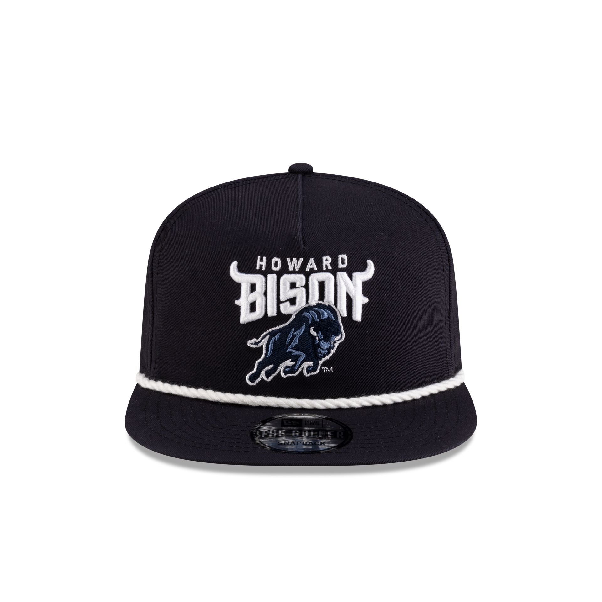 The Howard Bison Navy Golfer features an embroidered Bison logo at the front panels with a matching logo at the right-wear side, a snapback closure at the rear, and a gray undervisor.