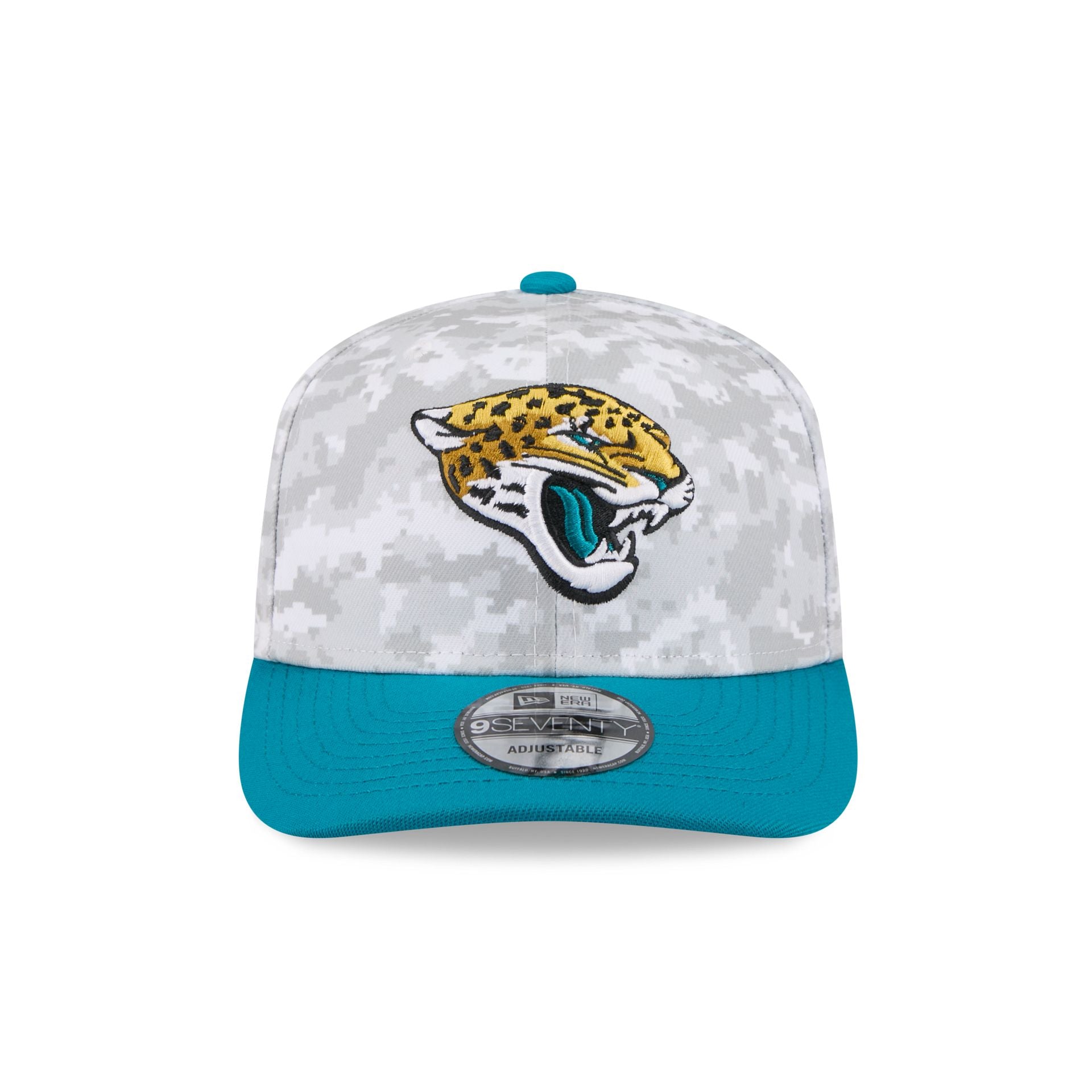 The Jacksonville Jaguars 2025 Salute to Service Fan Gear 9SEVENTY Stretch-Snap Cap features an embroidered Jaguars logo at the front panels with the official NFL Salute to Service patch above a snapback closure at the rear, an American flag patch at the right-wear side, and a team color visor.