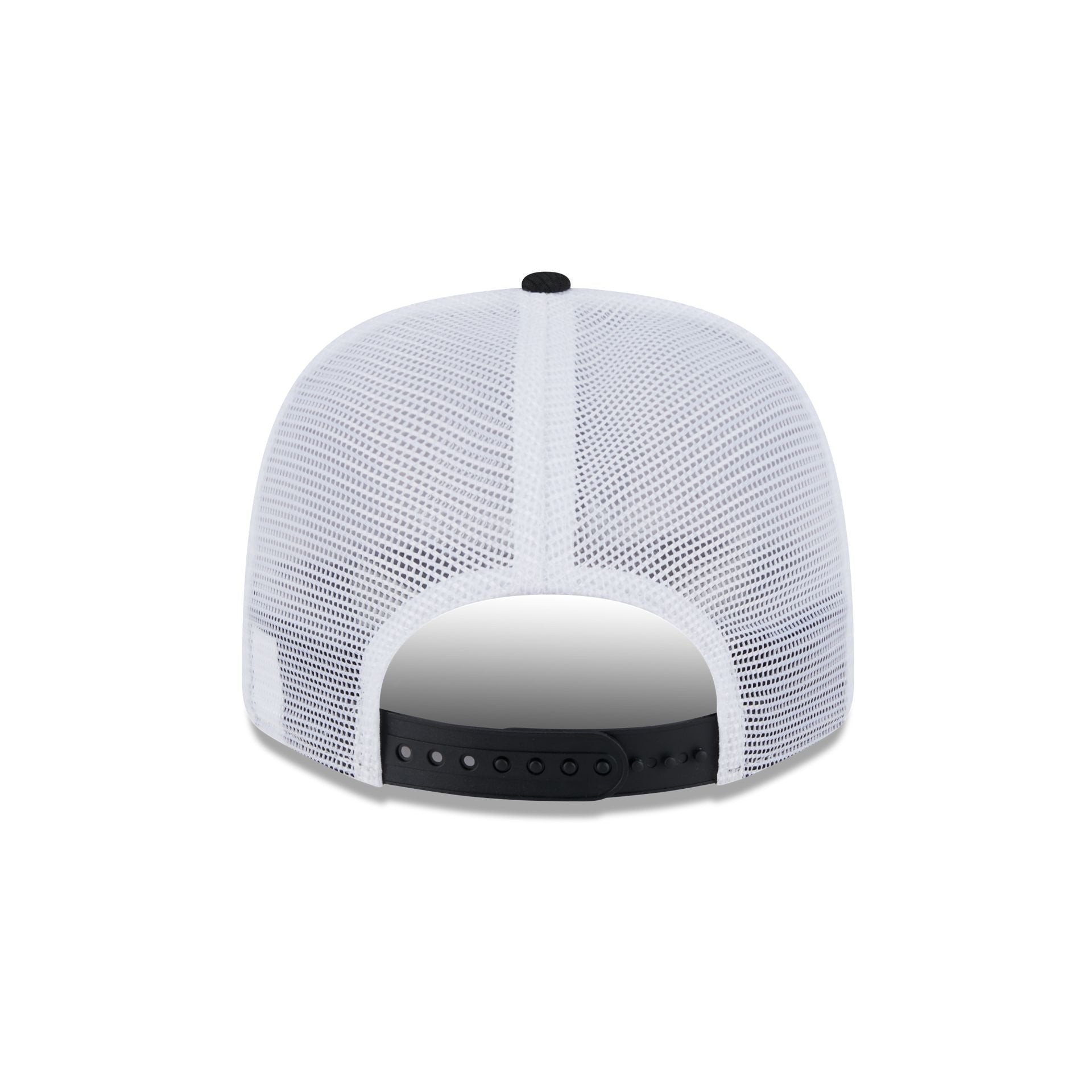 The Miami Marlins 2025 Batting Practice 9SEVENTY Trucker Hat features an embroidered Marlins logo at the front panels with a mesh back, a snapback closure at the rear, and a gray undervisor.