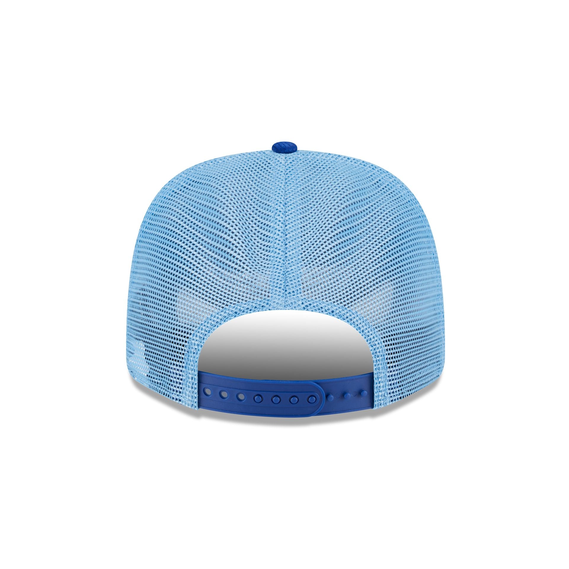 The Milwaukee Brewers 2025 Batting Practice 9SEVENTY Trucker Hat features an embroidered Brewers logo at the front panels with a mesh back, a snapback closure at the rear, and a gray undervisor.