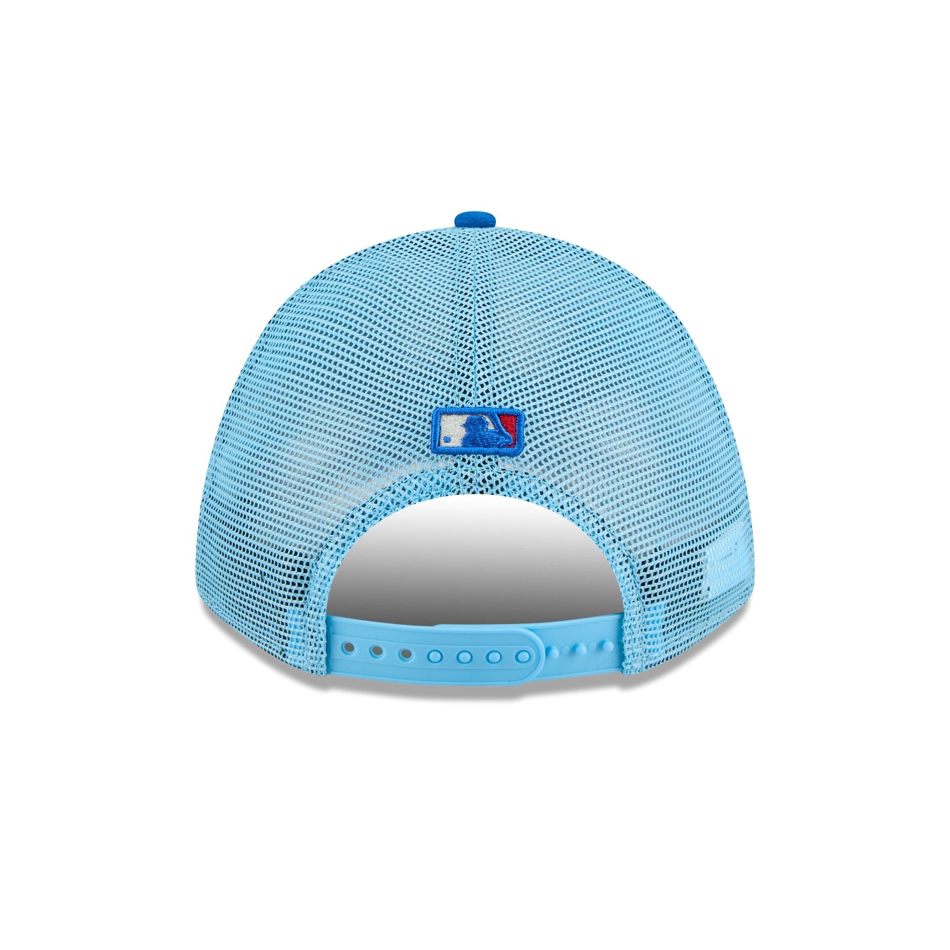 The New York Yankees Independence Day 2025 9FORTY M-Crown A-Frame Trucker features an embroidered American flag themed Yankees logo at the front panels with a matching MLB Batterman logo above a snapback closure at the rear, a blue visor, and a gray undervisor.