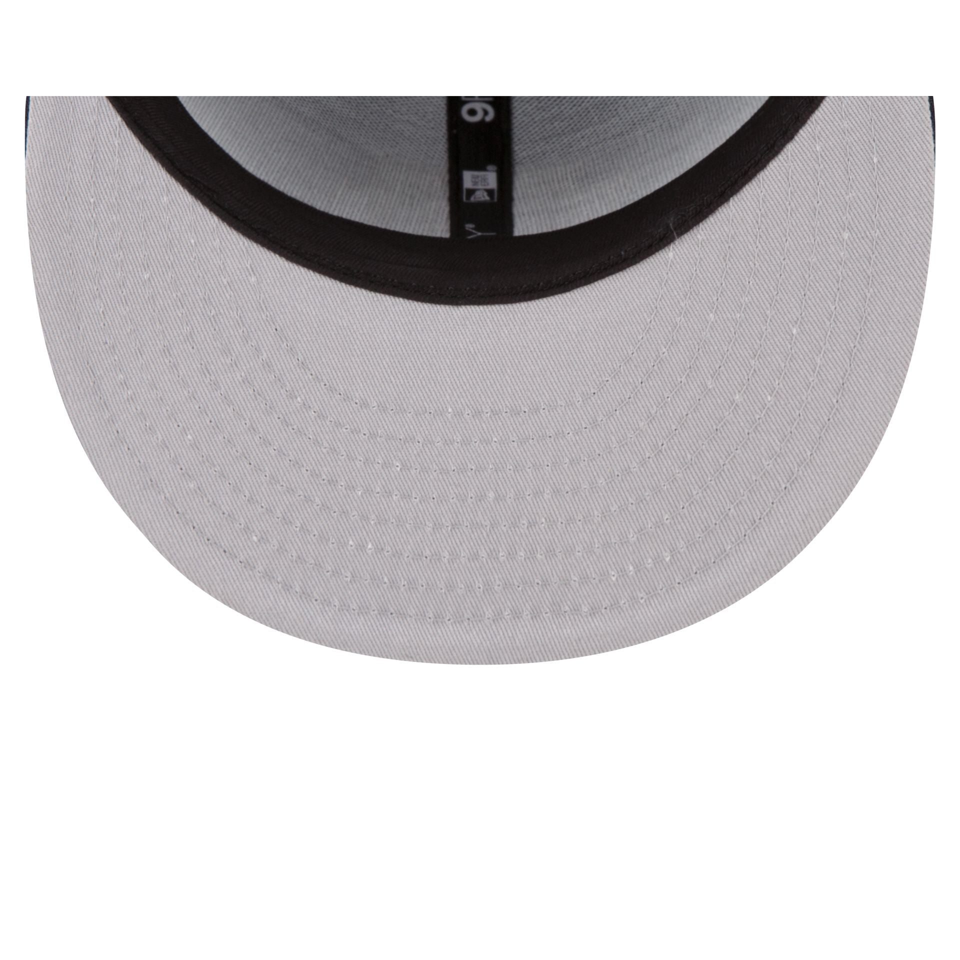 The Notre Dame Fighting Irish 9FIFTY Snapback features an embroidered university logo at the front panels with a Fighting Irish logo at the right-wear side and a snapback closure at the rear. Additional details include a navy crown and visor with a gray undervisor.