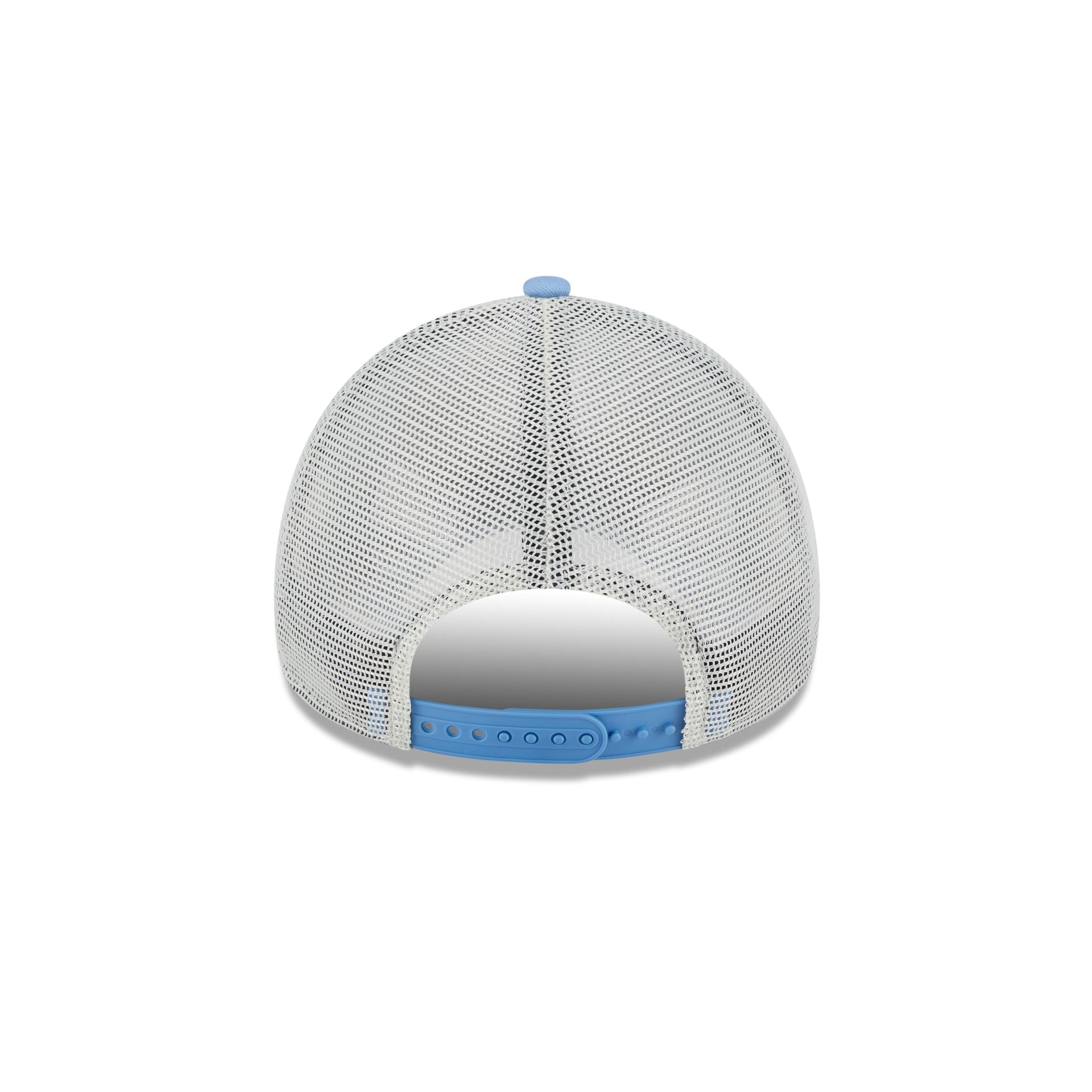 The Rayados Alt Team Color 9FORTY Trucker features an embroidered Rayados logo at the front panel with an orange visor, blue undervisor, and a snapback closure at the rear.