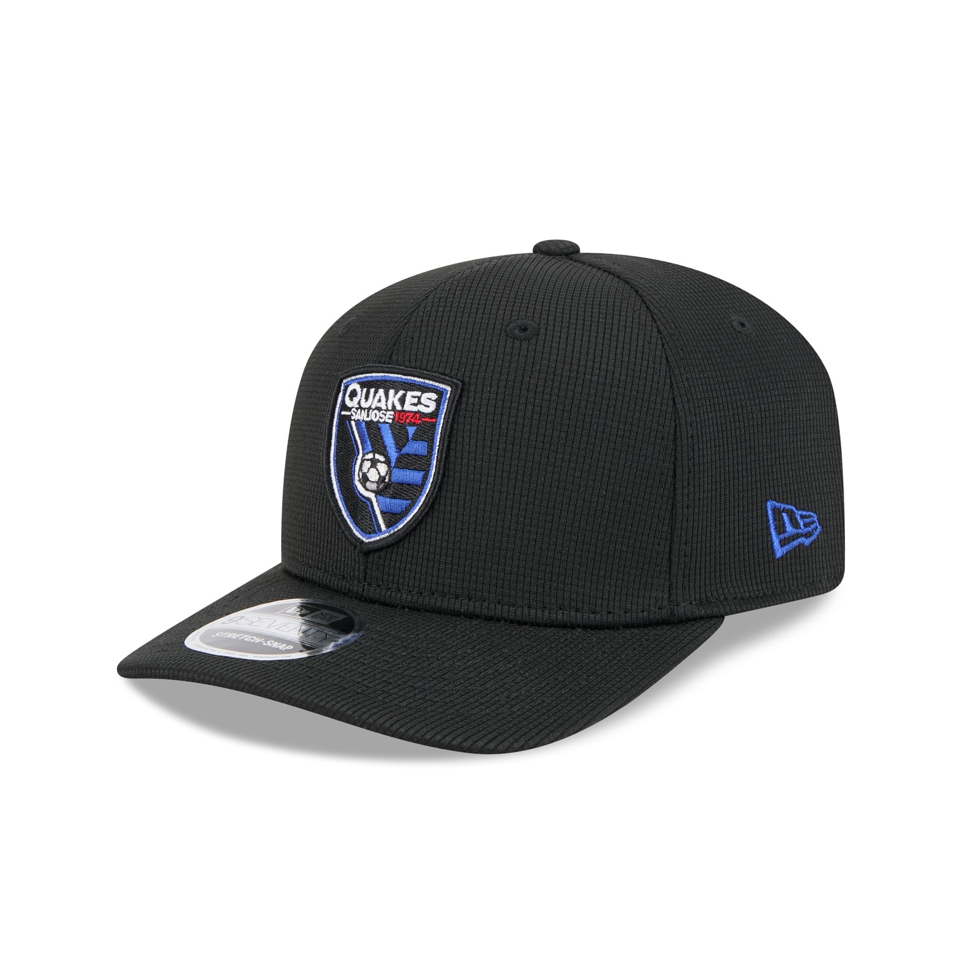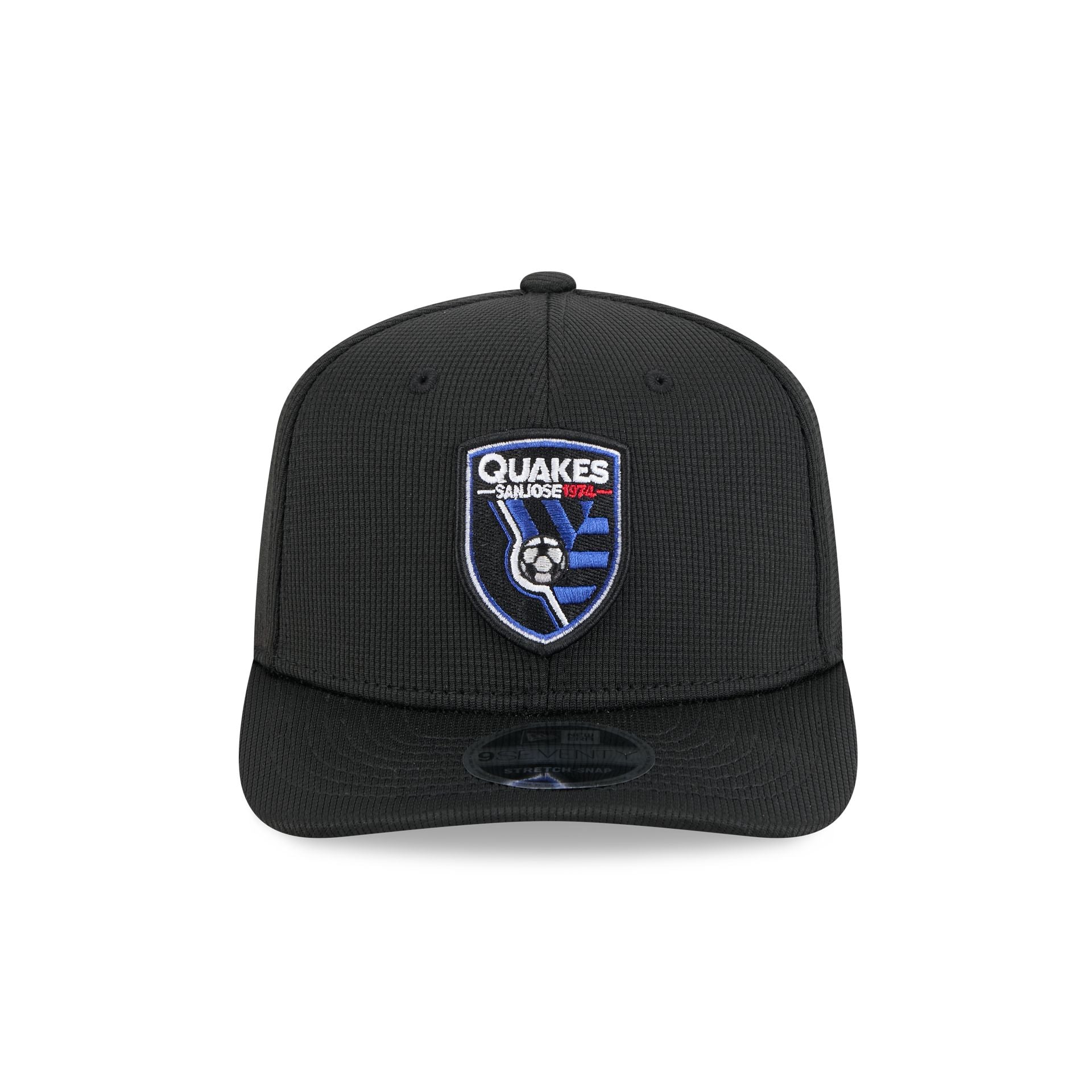 The San Jose Earthquakes 2025 Jersey Hook 9SEVENTY Stretch-Snap features an embroidered Earthquakes logo at the front panels with a patch at the right-wear side and a snapback closure at the rear.