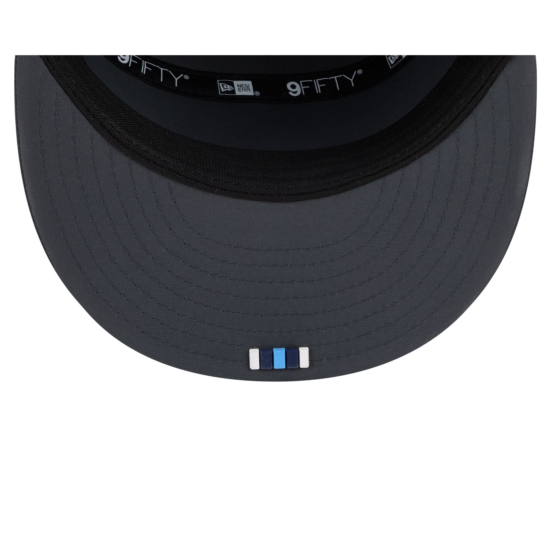 The Tennessee Titans 2025 Sideline Cold Weather Steel Clouds Split Panel 9FIFTY Snapback features a sewn-down silicone Titans logo patch at the front panels with a split-crown construction and diamond quilting. The cap has a water-repellent quill tech fabrication throughout, with a quick-dry cushioned sweatband to absorb moisture. Additional details include the Official NFL Shield logo to the right of a soft silicone snapback closure at the rear with eyelets at each side panel. The undervisor is accented with a silicone transfer in the team’s colors.