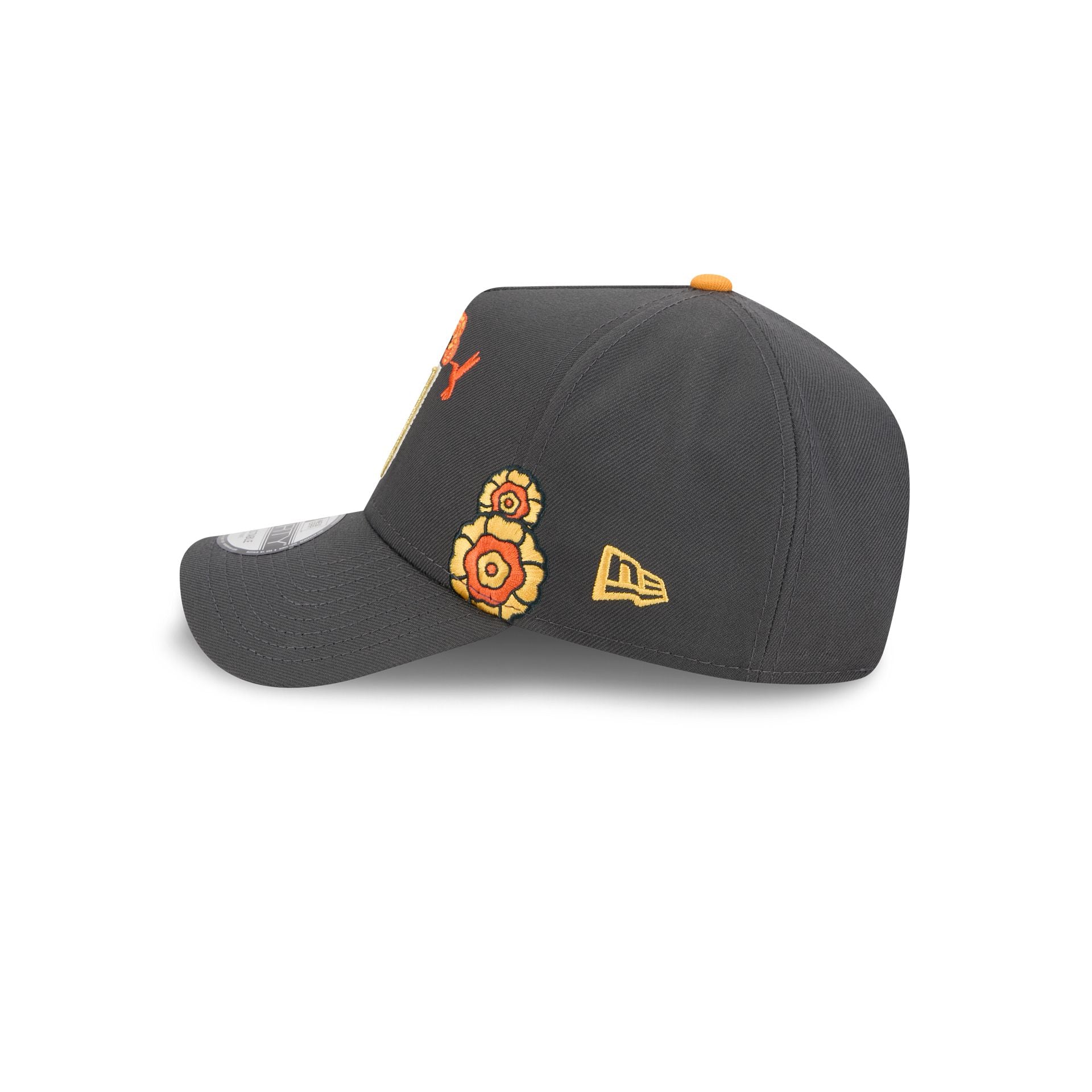 The Vegas Golden Knights Day of the Dead Graphite 9FORTY A-Frame Snapback features an embroidered Golden Knights logo at the front panels with marigold (cempasúchil) and hummingbird designs throughout, representing the Legend of Xóchitl and Huitzilin. Additional details include a team patch at the right-wear side and an adjustable snapback closure at the rear.